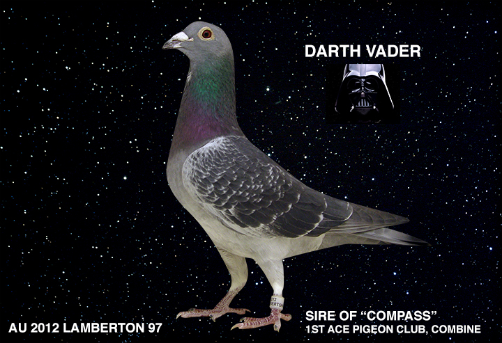 | AU 2012 LAMBERTON 97, DARTH VADER, is a beautifully balanced and buoyant male with very smooth silky feathers. He bred three young hens in 2014 and all three of them were in the top ten pigeons on our race team earning multiple AU Championship points and one of them, 47-14, "COMPASS," winning 1st Ace Pigeon in the Club and Combine. DARTH VADER's father is BELG 05 6046862 blue check male that was purchased in the breeding loft of Antoine Jacops, Vorselaar Belgium as a young bird. He is a genetic combination of the best racing pigeons from Antoine Jacops and Flor Engels. Jacops and Flor Engels were very close friends and exchanged their very best breeders as an outcross for each others breeding lofts. Antoine introduced me, Dr. John Lamberton, to Flor Engels and I snapped a picture of them together which can be seen at the bottom of this web page. DARTH VADER's dam, the DARK DIAMOND, is a granddaughter of Jacops' DIAMOND ACE, a 1st Ace Long Distance in the Antwerp Union Belgium and brother to two other 1st Provincial Ace pigeons: the SUPER ACE, a two-time 1st Ace Pigeon in 1988 and 1989, and the WITPEN ACE. The DARK DIAMOND also goes back to the excellent breeders of Flor Engels. Consequently, DARTH VADER is line-bred to the best pigeons of two of the most legendary racing pigeon fanciers in Belgium and the perhaps the world: Antoine Jacops and Flor Engels. | ||