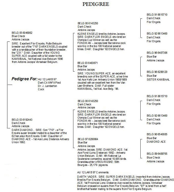 Lamberton Racing Pigeons AU 2012 LAMBERTON 97 DARK CHECK PIED COCK SIRE: BELG05 862 DAM: BELG03 443 Line-bred to Antoine Jacops & Flor Engels |