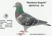 | AU 2012 LAMBERTON 97, DARTH VADER, is a beautifully balanced and buoyant male with very smooth silky feathers. He bred three young hens in 2014 and all three of them were in the top ten pigeons on our race team earning multiple AU Championship points and one of them, 47-14, "COMPASS," winning 1st Ace Pigeon in the Club and Combine. DARTH VADER's father is BELG 05 6046862 blue check male that was purchased in the breeding loft of Antoine Jacops, Vorselaar Belgium as a young bird. He is a genetic combination of the best racing pigeons from Antoine Jacops and Flor Engels. Jacops and Flor Engels were very close friends and exchanged their very best breeders as an outcross for each others breeding lofts. Antoine introduced me, Dr. John Lamberton, to Flor Engels and I snapped a picture of them together which can be seen at the bottom of this web page. DARTH VADER's dam, the DARK DIAMOND, is a granddaughter of Jacops' DIAMOND ACE, a 1st Ace Long Distance in the Antwerp Union Belgium and brother to two other 1st Provincial Ace pigeons: the SUPER ACE, a two-time 1st Ace Pigeon in 1988 and 1989, and the WITPEN ACE. The DARK DIAMOND also goes back to the excellent breeders of Flor Engels. Consequently, DARTH VADER is line-bred to the best pigeons of two of the most legendary racing pigeon fanciers in Belgium and the perhaps the world: Antoine Jacops and Flor Engels. | ||